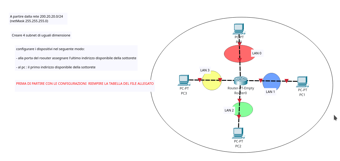 Creare 4 subnet di uguali dimensione Completare la tabella in allegato configurare i dispositivi nel seguente modo: